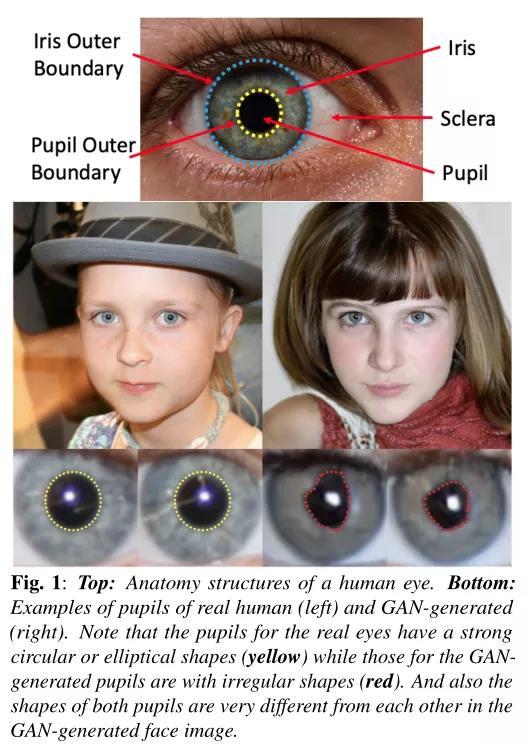 在这些场景下,如何从大量图片信息中分类出真实人脸与虚拟人像便成为了一个新的问题。来自 UAlbany 的学者们提出了一种基于物理的方法,通过暴露出 GAN 模型本身与真实物理世界交互的缺陷来巧妙识别出真实人脸与虚拟人像的方法,即通过识别瞳孔的形状来判断人脸的真实与否。