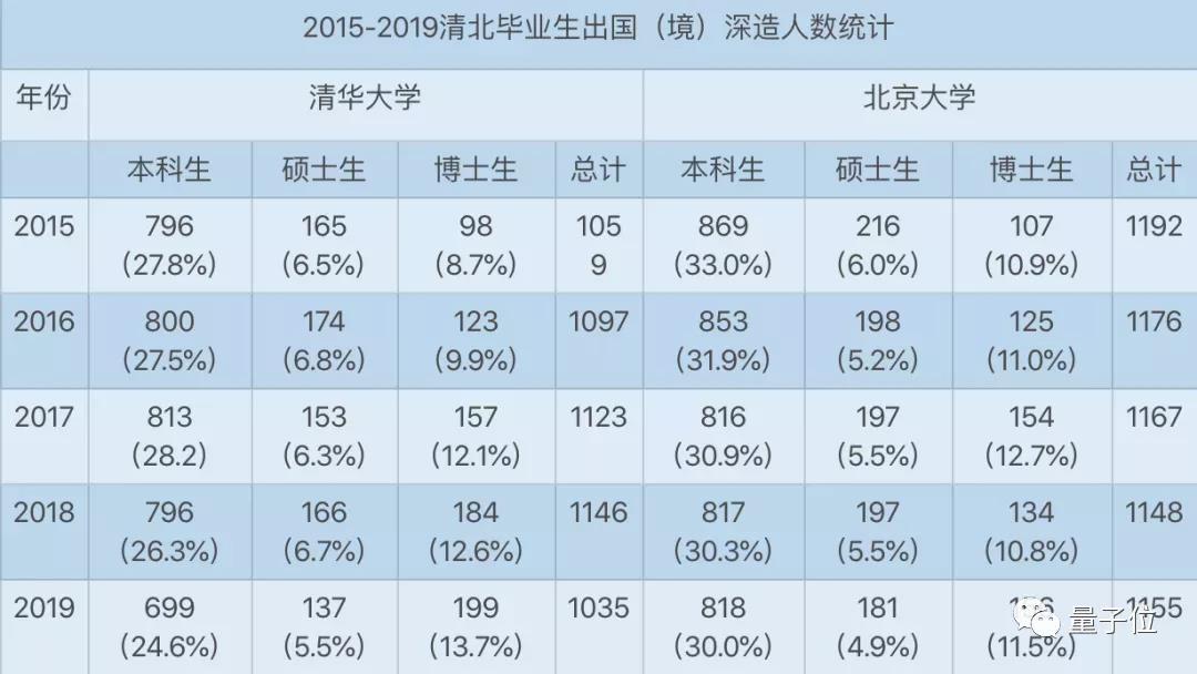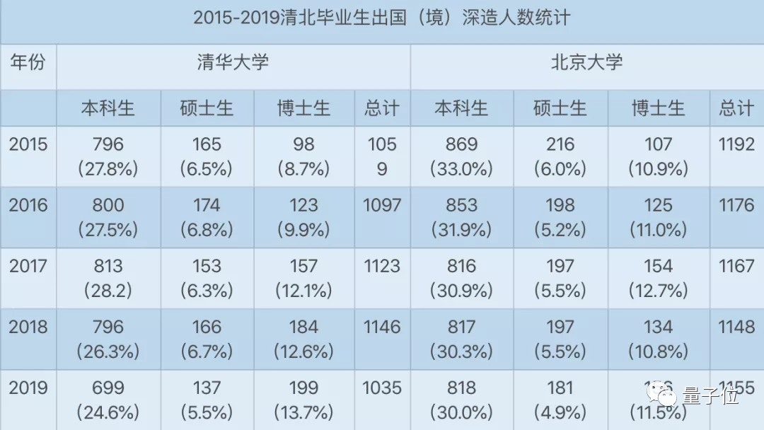 2015-2019年,清华、北大毕业生每年出国(境)深造人数平均为1052人、1168人,在两校毕业生中占比均在16%左右。
