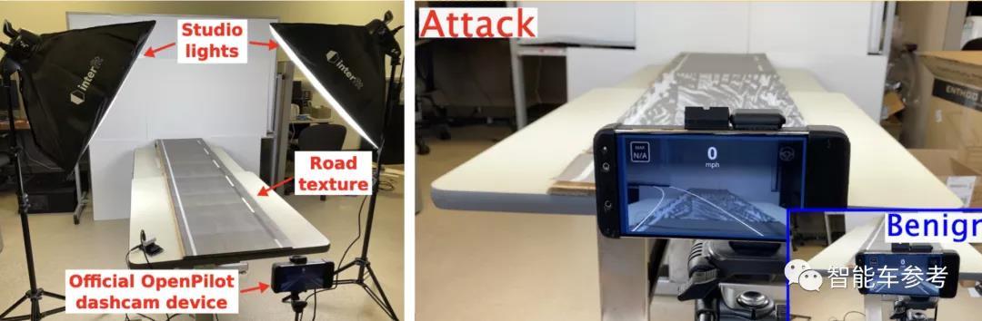 左边是正常情况,右边是作者将攻击数据(即受攻击时的到路线检测结果)直接注入到部署了OpenPilot辅助驾驶系统的真车上的情况,同一台车(丰田凯美瑞2019款)。
