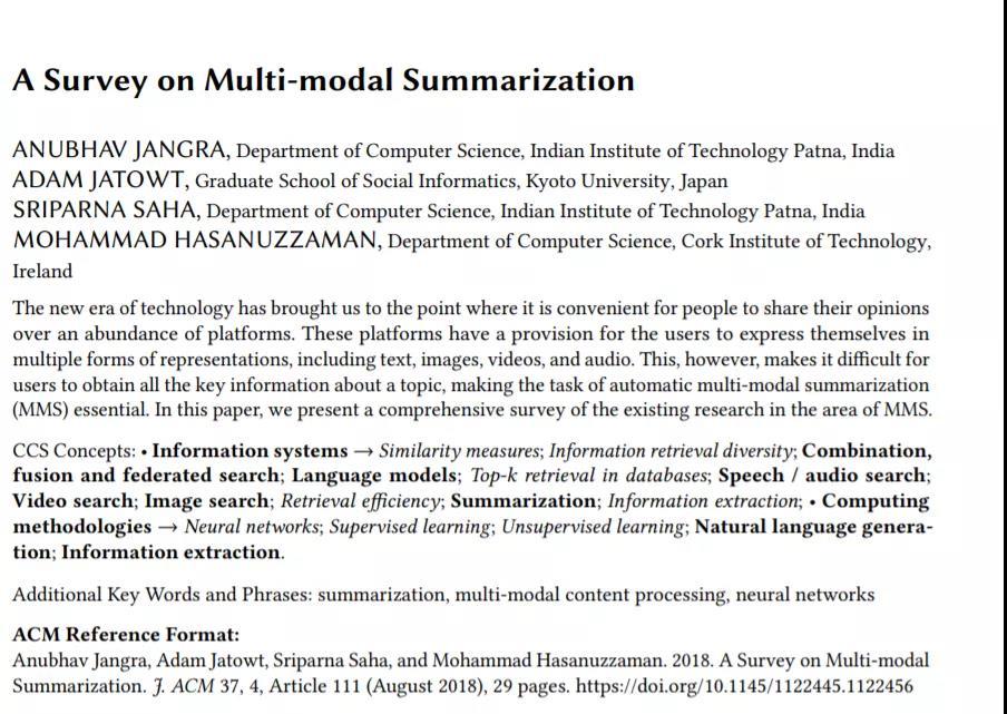 科技的新时代让人们可以方便地在各种平台上分享自己的观点。这些平台为用户提供了多种形式的表达方式,包括文本、图像、视频和音频。然而,这使得用户很难获得关于一个主题的所有关键信息,使得自动多模态摘要(MMS)的任务必不可少。在本文中,我们对MMS领域的现有研究进行了全面的综述。