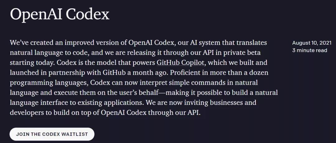 7月,OpenAI和GitHub合作开发了GitHub Copilot,这个功能可帮助程序员自动改进或更新软件,在这个基础上,借助GitHub上数十亿行代码,Codex最终获得了将英语翻译成代码的能力。