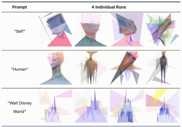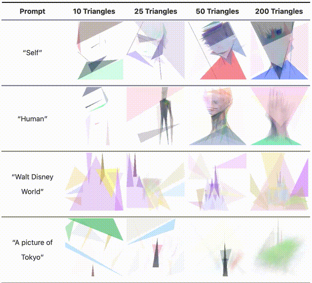 现在,给AI一个短语和50个三角形,它就能创作一副极简风格的抽象画了。