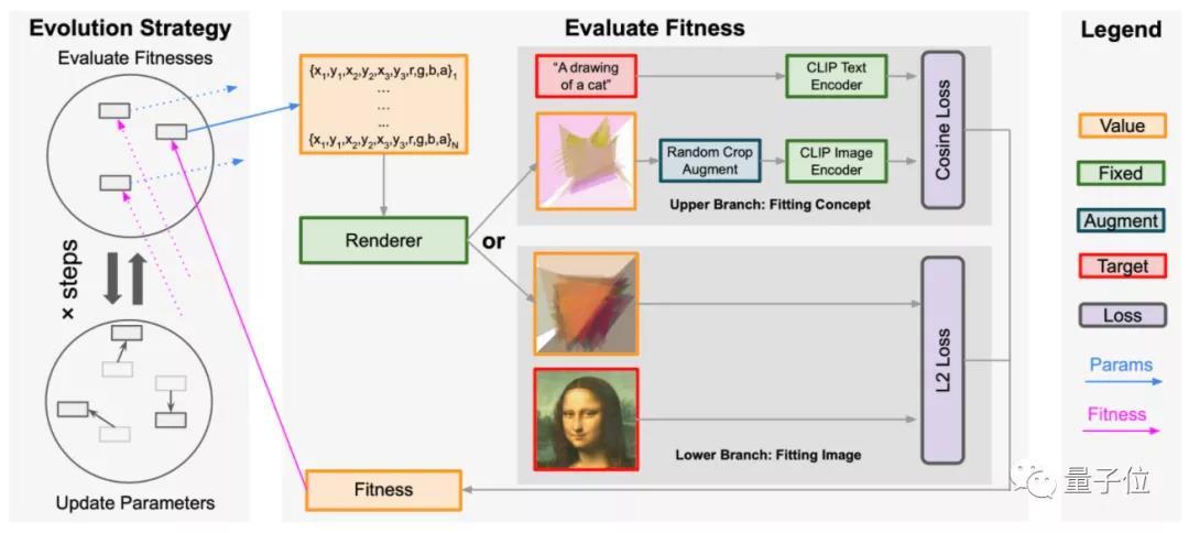 它会对ES算法给出的三角形图像与文字描述的相似度进行打分,然后将结果反馈给ES算法,ES算法就会为了提升分数而不断迭代,最后得到一副艺术画。