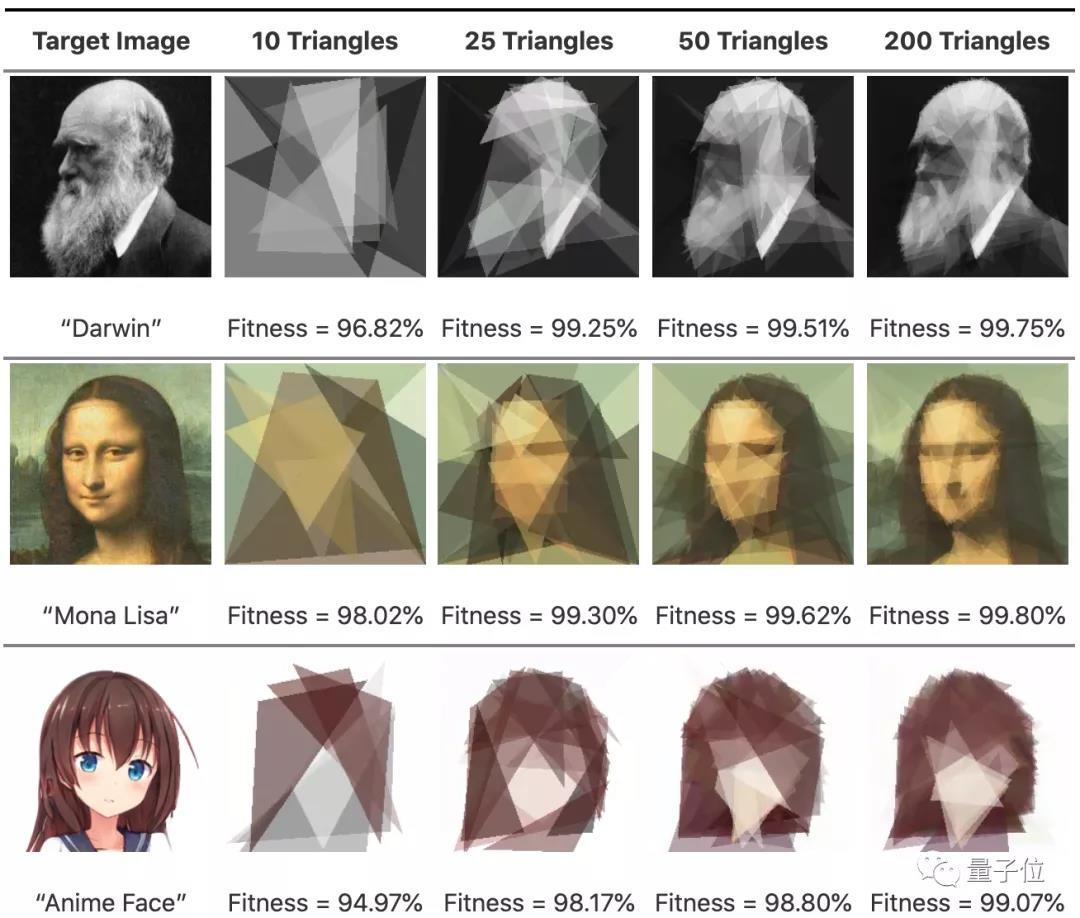其中达尔文和蒙娜丽莎的例子,fitness几近达到了100%。