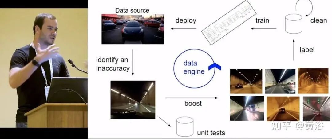 如图是Tesla众所周知的Autopilot数据引擎框架:确认模型误差、数据标注和清洗、模型训练和重新部署。