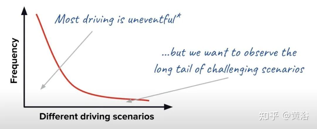 最近自动驾驶和数据闭环结合在一起成为一大解决方案,原因是自动驾驶工程已经被认可是一个解决数据分布“长尾问题”的任务,时而出现的corner case(极端情况)是对数据驱动的算法模型进行升级的来源之一,如图所示。