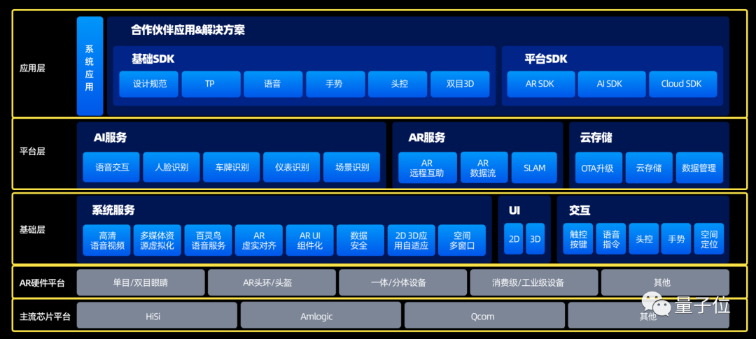其中,基础层主要包括AR眼镜能实现的一些基本系统服务,比如戴上眼镜就能看到巨幕界面、2D/3D切换、语音交互等等。