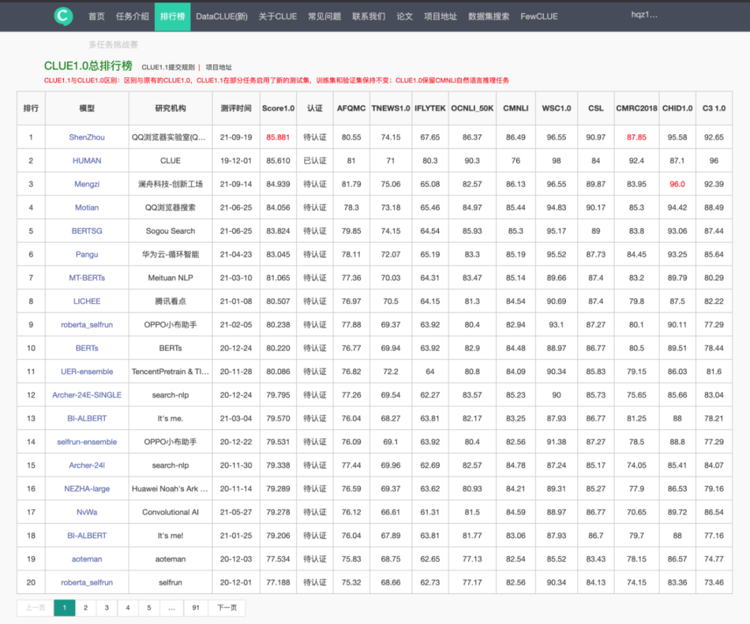 为了进一步验证预训练模型的效果,腾讯 QQ 浏览器实验室在中文语言理解测评基准 CLUE 榜单上进行了效果验证,于 2021 年 9 月 19 日登顶 CLUE1.0 总榜单 / 分类榜单 / 阅读理解榜,全部超过人类水平,同时也在 CLUE 1.1 的总榜单 / 分类榜单 / 阅读理解榜均取得了第一的成绩。