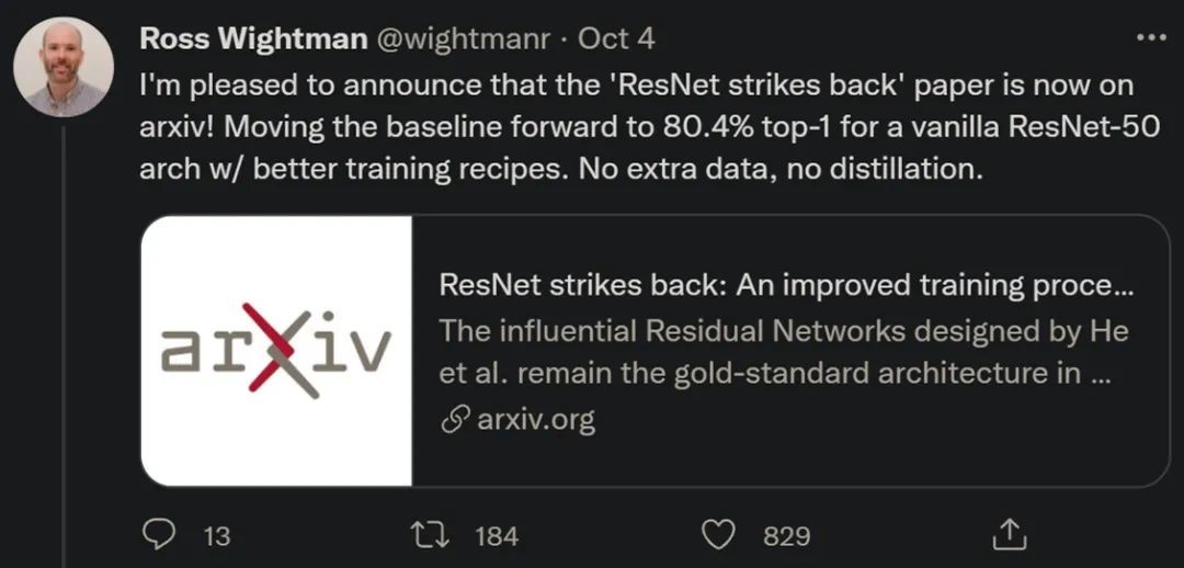 自提出以来,ResNet 系列模型一直被用作研究中的默认架构,或者新模型提出时用来对比的基线。然而,在过去的几年里,神经网络训练方面的最佳实践已经取得了很大进展。新颖的优化、数据增强等方法提高了训练流程的有效性。