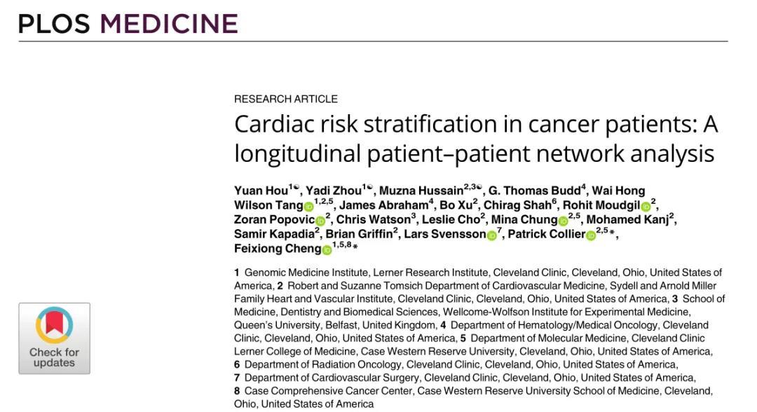 本文介绍克利夫兰诊所Feixiong Cheng教授团队发表在PLOS MEDICINE的工作:作者利用基于拓扑的K-means聚类方法对来自一般人口统计学、超声心动图、实验室测试和心脏因素的数据进行无偏倚、基于系统的患者-患者网络分析,开发了一种纵向的患者-患者网络聚类方法,用于癌症患者在抗癌治疗期间的心脏风险分层。通过整合所有患者-患者网络模型,开发一个在线风险计算器。其可视化了癌症治疗前、中、后患者心脏风险分层的决策边界,为识别新的心脏风险亚群和临床可操作的生物标志物提供巨大的希望,从而快速发展精确的心脏肿瘤学。