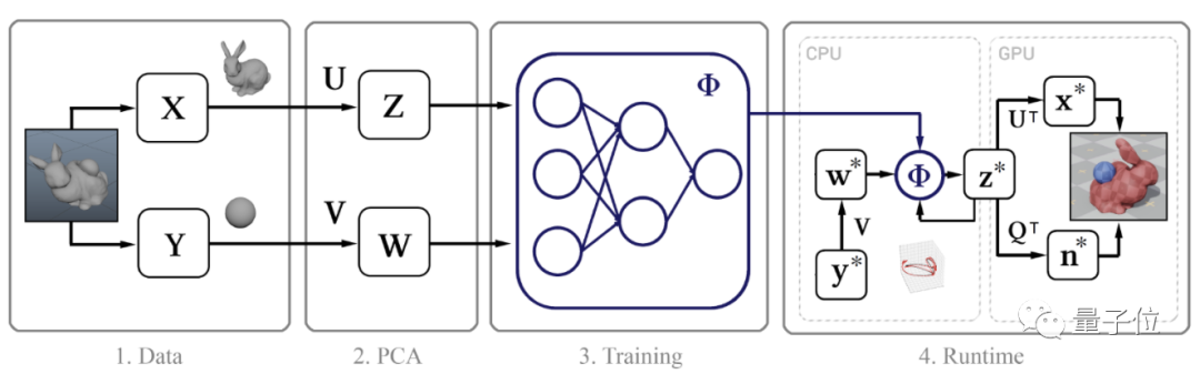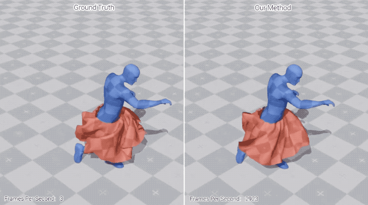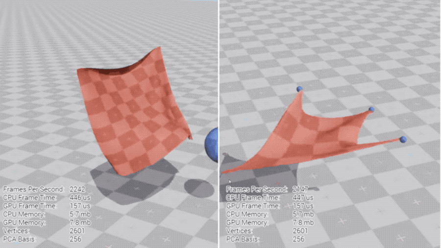 在物理模拟上,他们把要模拟的物体在前3帧的位置作为输入,喂给神经网络来预测下一帧,还用主成分分析法(PCA)简化计算,最终把不同类型物理模拟的速度提高了300-5000倍。
