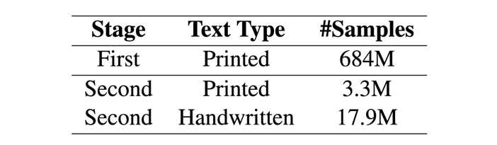 为了构建一个大规模高质量的数据集,研究员们从互联网上公开的 PDF 文档中随机选取了两百万张文档页面。由于这些 PDF 是数字生成的,因此通过把 PDF 文档转换为页面图像,然后提取文本行和裁切图像就可以得到高质量的打印体文本行图像。第一阶段的预训练数据一共包含6亿8千万文本行数据。