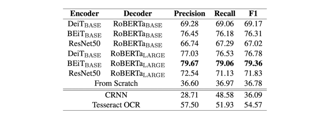 首先,研究员们比较了不同编码器和解码器的组合,来寻找最佳的模型设定。研究员们比较了 DeiT,BEiT 和 ResNet50 网络作为编码器的选项。在比较中,DeiT 和 BEiT 均使用了论文中 base 的模型设定。对于解码器而言,研究员们则比较使用了 RoBERTa-base 初始化的 base 解码器和使用 RoBERTa-large 初始化的 large 解码器。作为对照,研究员们对随机初始化的模型、CRNN 基线模型以及 Tesseract 开源 OCR 引擎也进行了实验。