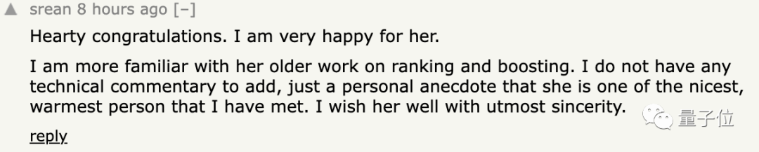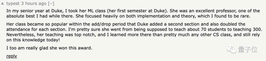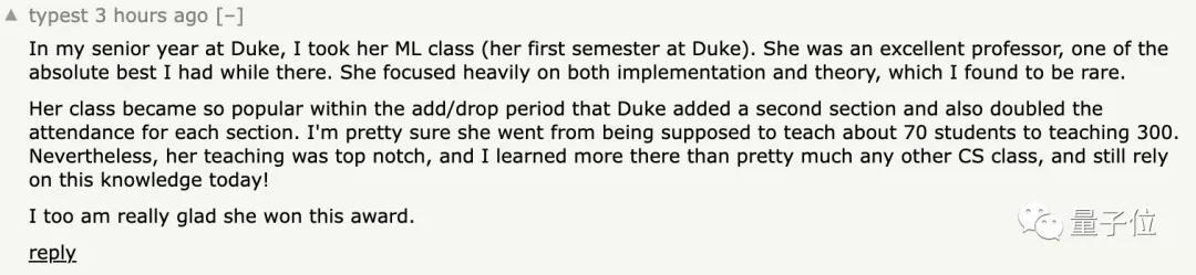 获奖消息公布后,很多她的学生都在网络上表示祝贺,说上学时候她的课很受欢迎,并且理论和应用同样受重视的课程并不多见。