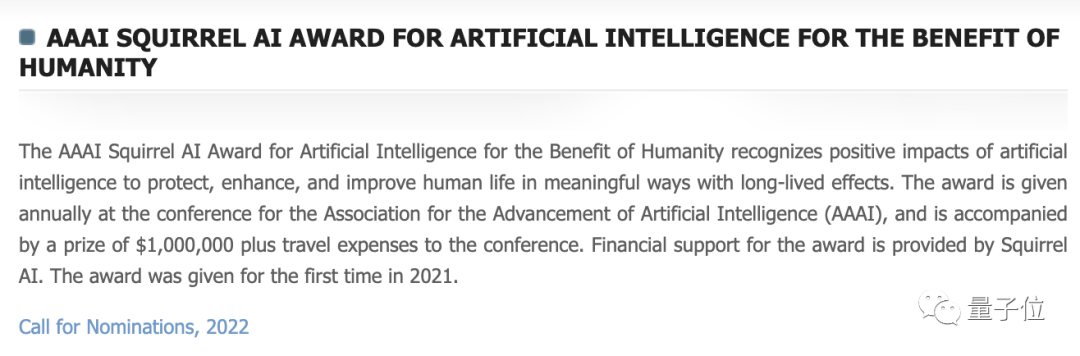 该奖项由AAAI和松鼠AI联合颁发,全称为“人工智能人类福祉奖”,也被称为”AI界的诺贝尔奖”。