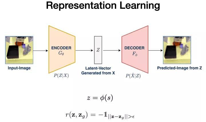 在这个潜在空间的距离是有意义的,为我们自我评价成功的关键机制铺平了道路。给定当前图像s和目标图像g,我们将它们编码进潜在空间,并设定它们可以获得奖励的距离阈值。
