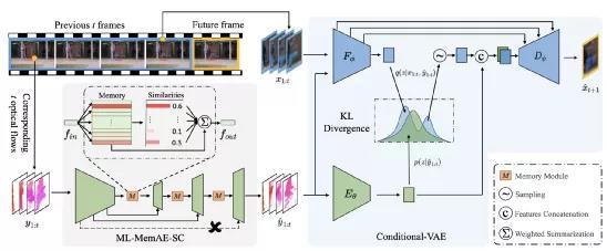 本文方法也是遵循以上设定,在普通自动编码器的基础上进行改进,加入了一系列的记忆模块来对正常事件进行建模,同时整合帧预测任务和光流重建任务。本文的一个亮点是,以重构的光流作为条件,设计了一个条件变分自动编码器(Conditional Variational Autoencoder,CVAE),用来捕获视频帧与光流场之间的相关性,并以此相关性来影响帧预测的质量。当模型遇到异常事件时,光流重建带来的误差会进一步影响帧预测的效果,使异常事件更易于检测。