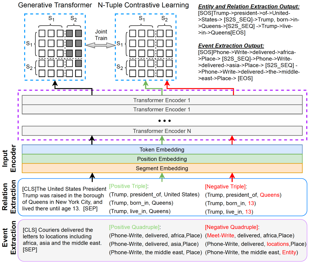 为了解决这些问题,我们扩展了之前发表在AAAI2021的工作[1],提出了基于对比学习的生成式信息抽取模型(CGT)。该框架基于一个共享的Transformer模块,采用编码器-解码器的生成式N元组抽取和对比学习的多任务学习模式。我们首先使用分隔符和部分因果掩码机制将输入序列与目标序列连接起来,以区分编码器-解码器表示形式。然后,我们提出一个N元组对比优化目标来约束模型,其中真实的N元组作为正样本,随机采样的N元组构作为负样本。为了同时优化N元组生成目标和对比学习目标,我们引入了分批的动态注意掩码机制,该机制允许我们动态选择不同的掩码机制并优化任务。最后,我们采用了一种N元组校准算法,在推理阶段过滤掉违背事实的N元组。