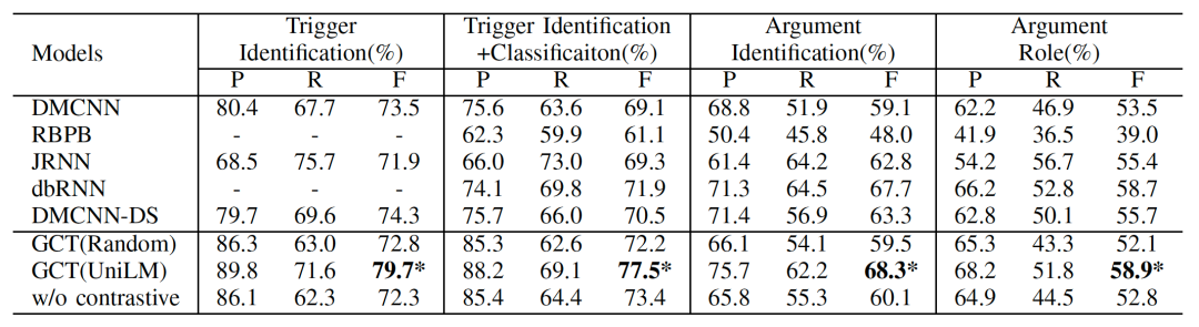 我们分别对五个基准数据集(实体关系抽取、事件抽取)进行了实验:NYT,WebNLG和MIE、ACE-2005、MUC-4。MIE是医学领域的大规模中文对话信息提取数据集。我们在五个数据集上都取得了较好的效果。可以看出,对比学习的引入显著提升了模型效果。此外,与基于分类的模型相比,生成式具有较大的搜索空间,模型优化较为困难,因此在某些数据集上仍然无法取得最优效果。