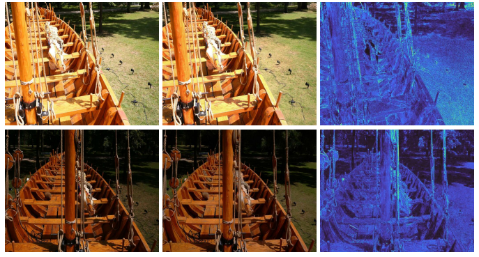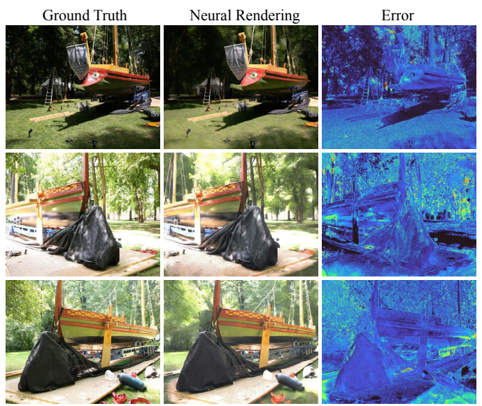 图11:在罗马船只数据集上合成的新视图。使用与参考照片相同的曝光值对图像进行渲染。在右列中,每个像素的误差都是可视化的。