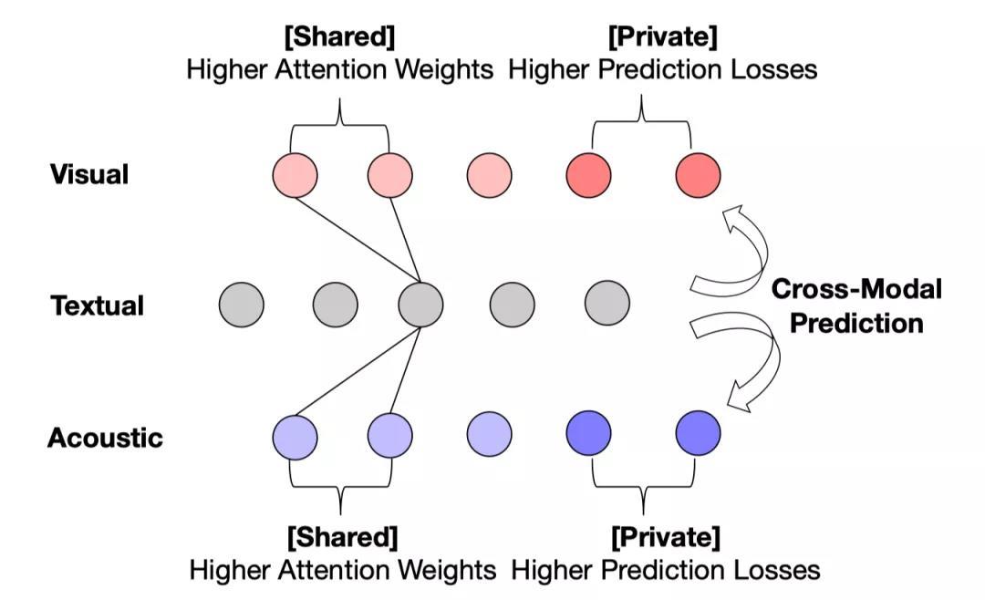 以往的多模态特征融合研究都是将是三个模态特征视为同等重要,然后隐式地对不同模态之间的交互进行建模。我们认为更深入的研究不同模态对于目标任务的贡献以及显式的分析和建模不同模态特征之间的关系将会帮助模型更有效的进行多模态特征融合。并且,我们提出了两点观察,第一点是,多模态情感分析中文本模态占据主要地位,以往实验结果表明当去掉文本模态后模型结果相比去去掉其它模态产生了巨大的下降。第二点是,相对于文本模态来说,其他模态提供了两类信息,一类信息是共享语义,共享语义没有提供文本模态外的信息,但可以增强相应的语义,并使得模型更加鲁棒。另一类信息是私有语义,私有语义提供了文本之外的语义信息,并可以使得模型预测更加准确。基于这两点观察,我们提出了一种基于跨模态预测的以文本为中心的共享私有框架。在该框架中,我们利用跨模态预测任务来分辨共享特征以及私有特征,并设计了以文本为中心的多模态特征融合机制对多模态特征进行特征融合。
