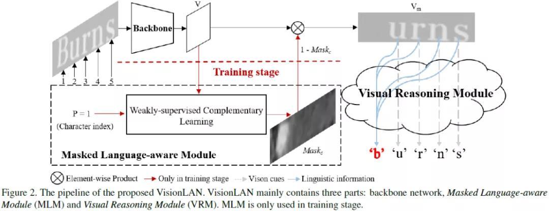 如上图所示,Vision-LAN模型包括三部分,特征提取网络,掩码语言感知模块(Masked Language Aware Module)和视觉推理模块(Visual Reasoning Module)。训练阶段,通过特征提取网络得到视觉特征,接着MLM模块输入视觉特征以及字符索引,通过弱监督的方法在对应字符索引的位置生成掩码Mask。该模块主要用来模拟视觉信息字符遮挡的情况。VRM模块输入带遮挡的文本图片,通过在视觉空间捕获长距离的信息,预测对应的文本行识别内容。在测试阶段,移除MLM模块,只使用VRM模块用于文本识别。由于无需额外的语言模型即可获取语言信息和视觉特征,Vision-LAN 可以零计算成本即获得语言信息。