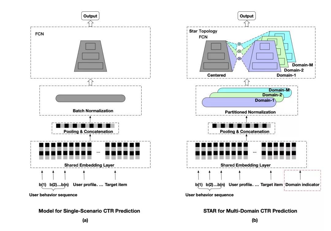 图1:(a)单场景CTR预估模型。(b):Multi-Domain CTR预估模型。
