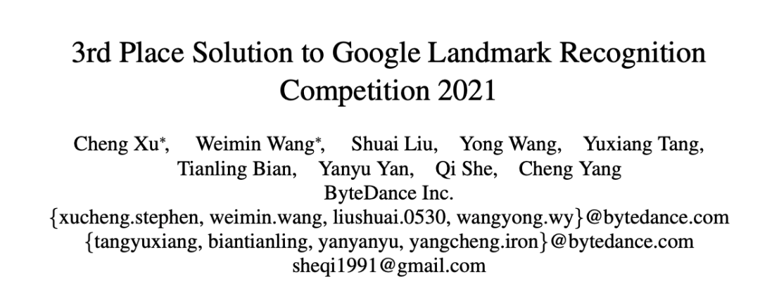 在今年举办的Google Landmark Recognition 2021比赛中,来自头条的团队获得了第三名的成绩。由于Kaggle比赛组队的限制,队伍最多人数是5人,但是头条团队论文在中却包含9个作者。