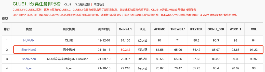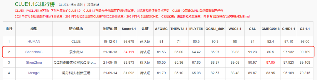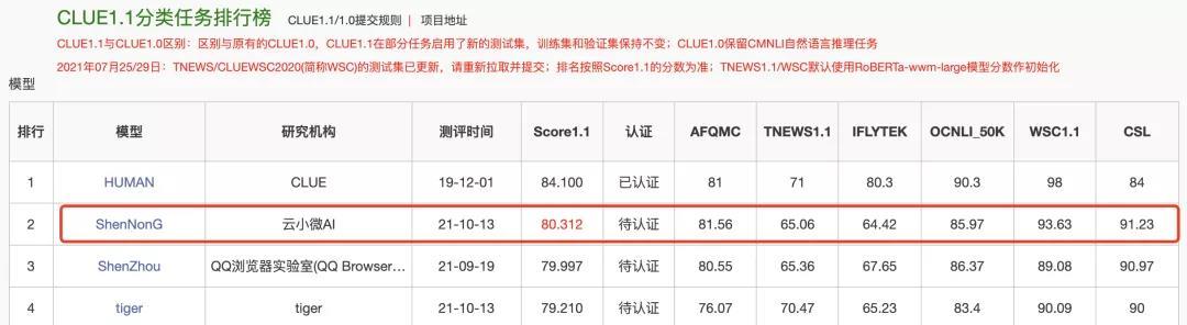 2021年10月13日,腾讯云小微与腾讯AI Lab联合团队提出了基于知识的中文预训练模型——“神农”,该模型仅包含十亿级参数量,并一举登顶CLUE总排行榜、1.1分类任务、阅读理解任务和命名实体任务四个榜单,刷新业界记录。