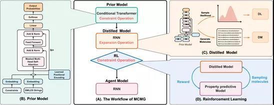 MCMG模型的工作流程下图所示。首先训练一个c-Transformer,然后将该c- Transformer蒸馏为RNN,以便于后续与RL的应用。蒸馏后的RNN不仅可以减轻RL时的训练负担,还可以提升生成分子的结构多样性。