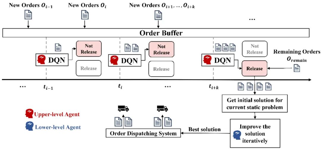 物流运输作为供应链的核心环节,需要针对动态生成的订单,在满足资源约束的条件下,合理高效地分派订单给车辆,以此加快物资的流动速度,降低运输成本,保障后续生产顺利进行。该动态取送货问题本质上是一个NP-Hard的组合优化问题,其订单动态产生且存在多种复杂约束。针对该问题,我们首次提出了一个基于分层强化学习的优化框架。其中上层智能体根据订单超时风险,将整个动态问题切分为不同规模的静态子问题。下层智能体则针对每个子问题,进行快速局部搜索得到近似最优解,以完成车单匹配和车辆路径规划。该方法已部署于华为供应链订单调度系统中,相比于现有算法,订单总超时减少了超过20%,车辆平均行驶距离减少了超过10%,运输效率显著提升。目前诺亚方舟实验室已经开源了供应链仿真器,欢迎大家使用。(点击底部左下角“阅读原文”可直接进入)https://github.com/huawei-noah/xingtian/tree/master/simulator/dpdp_competition