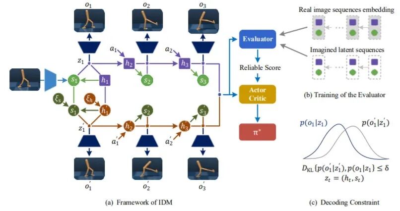 为了提高样本利用效率,基于模型的强化学习一直以来备受关注。根据智能体过往经验数据建立世界模型,基于模型产生虚拟轨迹再进行策略优化,类似人类的“想象”、“预判”和“规划”。而虚拟轨迹的多样性是决定样本效率和策略鲁棒性的重要因素。为了提升虚拟轨迹的多样性,受神经科学中记忆假体实验的启发,我们创新性的提出了从衍生记忆中想象未来轨迹的基于模型强化学习算法框架。与Dreamer等以经验池中存储的原始记忆为起点开始想象的方式不同,IDM首先在隐层空间生成区别于原始记忆的衍生记忆,然后再以衍生记忆为起点开始想象当前策略下的虚拟轨迹,以让智能体能够在隐层空间直接学习如何在真实世界中从未遇到过的场景中完成控制任务。为了保障用于策略优化的基于衍生记忆生成数据的可靠性,我们利用了两层算法机制:(1)在RSSM世界模型上添加了解码约束,用以保证衍生记忆可以对应到高维空间的真实可能存在状态避免解码失真;(2)所有虚拟轨迹均被赋予由评估器给出的预测可靠性权重,最优策略利用加权后的虚拟轨迹在Actor-Critic框架下迭代求解。在以视觉图像为输入的机器人控制任务DMControl上,该算法在样本效率和策略鲁棒性上均超越了当前最先进的基于模型强化学习算法。