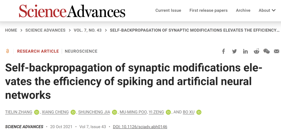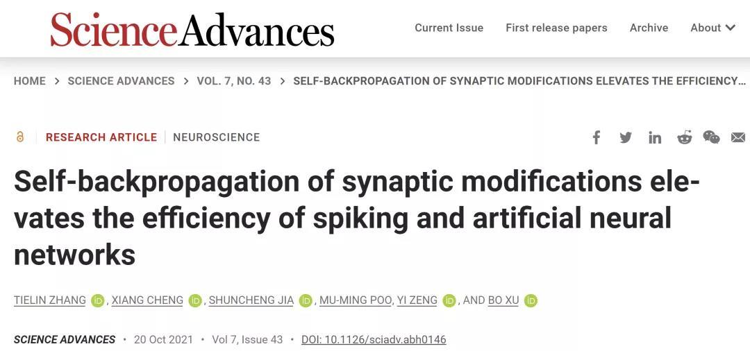 相关工作(Self-backpropagation of synaptic modifications elevates the efficiency of spiking and artificial neural networks)于2021年10月20日(美东时间)在线发表于《科学》子刊《Science Advances》上。中国科学院自动化研究所类脑智能研究中心张铁林副研究员为第一作者,徐波研究员为通讯作者,程翔(博士生)、贾顺程(博士生)、蒲慕明研究员和曾毅研究员为共同作者。相关研究工作得到了国家自然科学基金委、先导B等项目的资助。