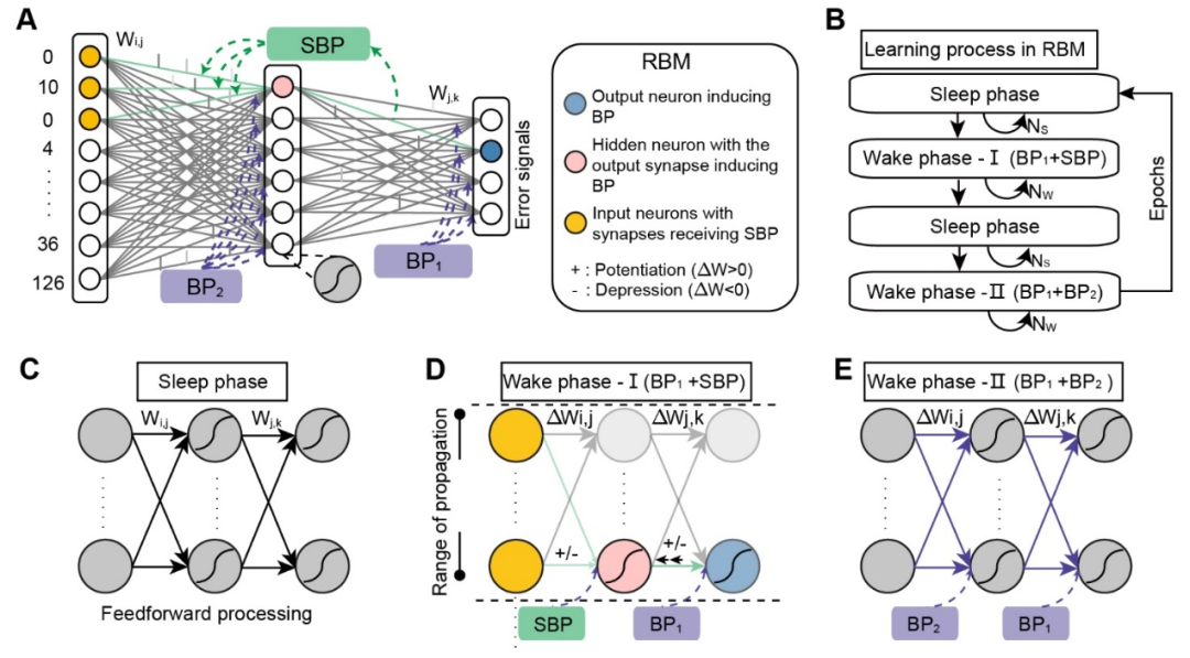 (A),SBP和BP在RBM中的组合优化。(B),SBP和BP的交替协作流程。(C),RBM中的标准Sleep Phase。(D),含有SBP的Wake Phase。(E),含有BP的Wake Phase。
