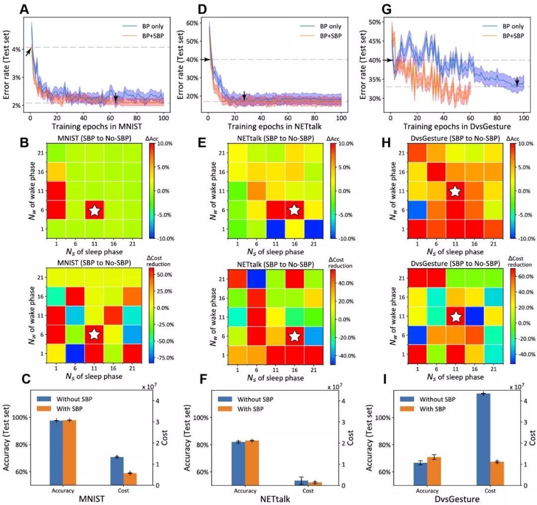 (A-C),在MNIST数据集中,SBP可以少量降低RBM的训练误差(A),可以同时平衡精度和能耗得到最优的Wake Phase次数(B),且可以显著降低训练能耗(C)。(D-I),在NETtalk和DvsGesture数据集中,SBP得到了和在MNIST中类似的结论。