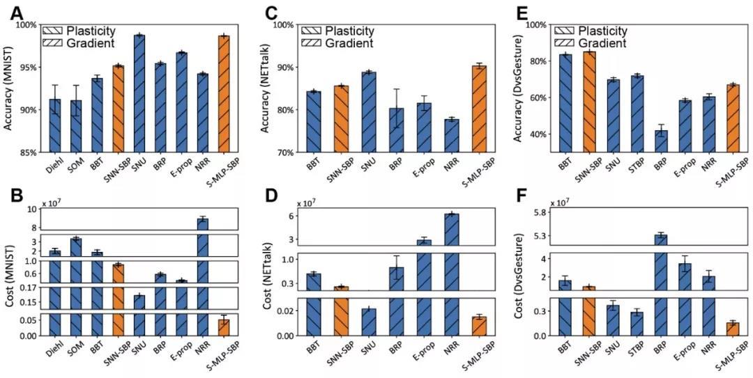 (A,C,E),SBP分别取得了基于梯度和基于可塑性方法的SNN最优性能。(B,D,F),SBP分别取得了基于梯度和基于可塑性方法的SNN最低能耗。