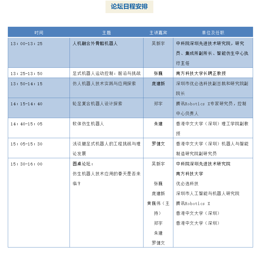 在今年的仿生机器人论坛设置上,首先由【吴新宇、张巍、庞建新、黄巍伟、郑宇、朱建、罗健文】七位老师分别做分享报告,随后设置圆桌论坛共同讨论仿生机器人的应用前景及发展。我们期待会这场论坛带来的思维碰撞,同时也更加期待在各位老师共话后,仿生机器人将迎来的全新的产学互动!
