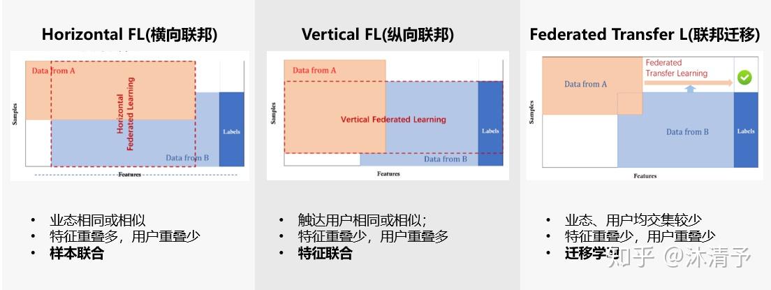 我们把每个参与共同建模的企业称为参与方,根据多参与方之间数据分布的不同,把联邦学习分为三类:横向联邦学习、纵向联邦学习和联邦迁移学习。