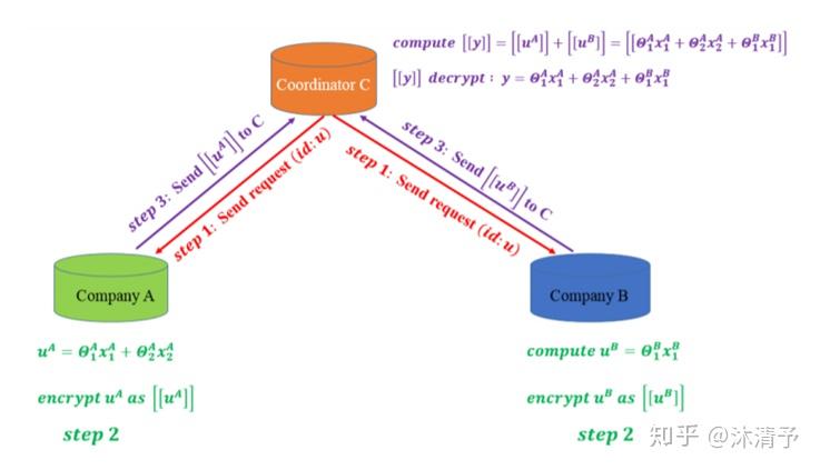 step2:A和B分别计算和自己相关的特征中间结果,并加密交互,用来求得各自梯度和损失;