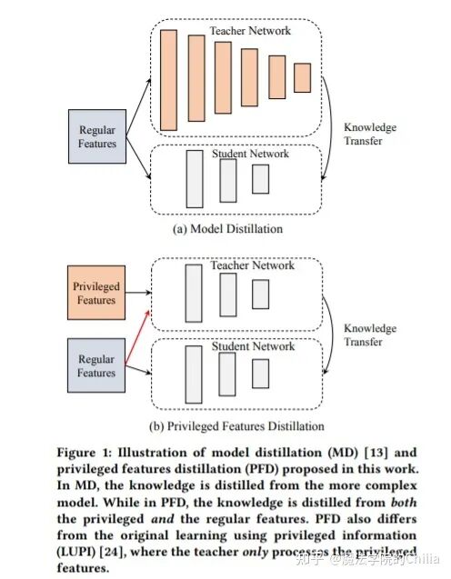 本文提出的PFD和普通的模型蒸馏(model distillation, MD)的区别在于,普通Model Distillation的Student和Teacher的输入相同,而Teacher的模型capacity明显大于Student,所以蒸馏的效果是降低模型参数。而PFD的Student和Teacher模型capacity一样,只是Teacher多加了优势特征。所以,这里的知识蒸馏并没有起到让模型轻量级的效果,而只是试图把Teacher学到的加入了优势特征的预测模型“教给”Student: