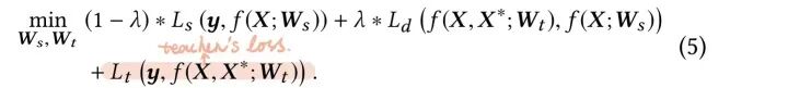 如上述公式中所示,教师模型的参数需要预先学好,这直接导致模型的训练时间加倍。所以,能不能同步更新学生和教师模型呢?同步更新的目标函数变成如下形式: