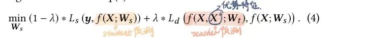 令X表示普通特征,X*表示优势特征,y表示标签,L表示损失函数,则特征蒸馏的目标函数抽象如下: