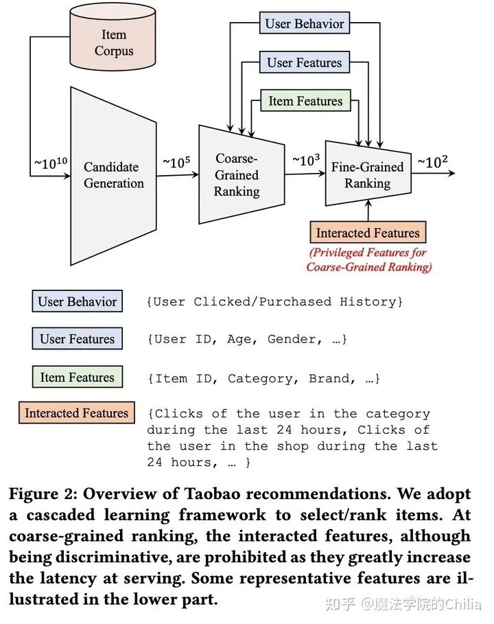 手淘推荐的流程框架图如下。所有的商品从会经历三个阶段:召回、粗排、精排。这三个阶段待打分的商品数会逐渐减少,模型会越来越复杂。