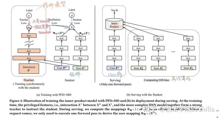 这里我们尝试在「粗排CTR」模型中使用这种PFD+MD技巧。在粗排中,我们使用「内积运算」对候选商品集合进行打分。事实上,无论采用何种映射表征用户或者商品,模型最终都会受限于顶层双线性(Bi-Linear)内积运算的表达能力。因为内积粗排模型可以看成是广义的矩阵分解。按照神经网络的万有逼近定理,非线性(Non-Linear)MLP,有着比双线性内积运算更强的表达能力,在这里很自然地被选为更强的教师模型。下图给出了粗排PFD+MD蒸馏框架示意图。事实上,图中加了优势特征的教师模型就是我们「线上精排CTR模型」,所以这里的蒸馏技巧也可以看成粗排反向学习精排的打分结果。