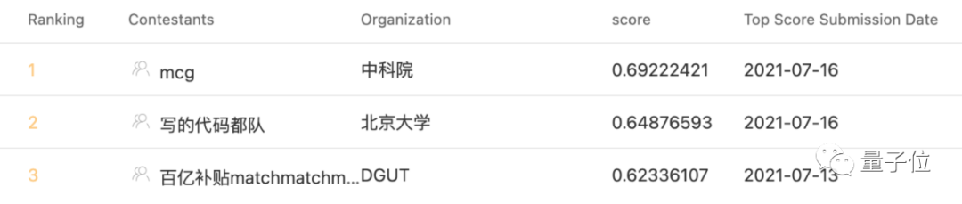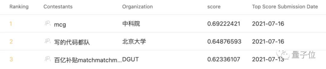 最终,来自中科院计算所的「mcg」夺得冠军,来自北大、南京大学、湖南大学的「写的代码都队」夺得亚军,来自中南大学、DGUT和华南理工大学的「百亿补贴matchmatchmatch」获得第三名。