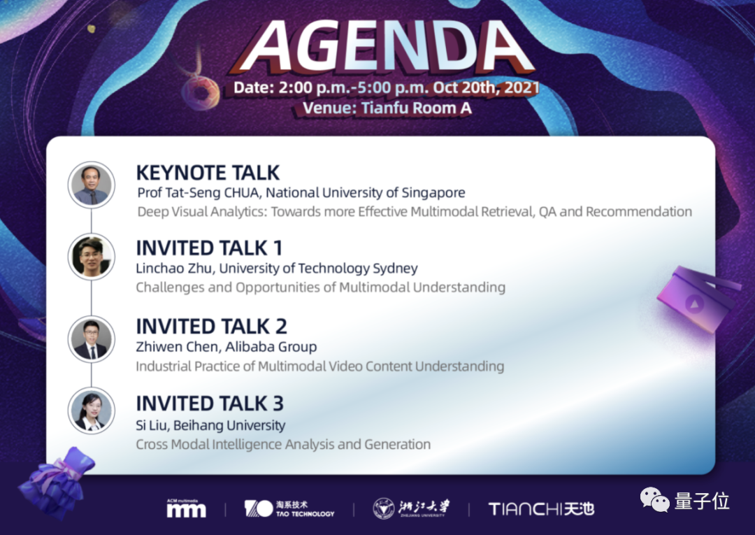 此外,还有不少AI领域的教授也在这次Workshop上做了演讲,其中就包括新加坡国立大学计算机学院的KITHCT讲座教授Tat-Seng Chua、北京航空航天大学的刘偲副教授、悉尼科技大学青年研究员朱霖潮、淘系技术高级算法专家陈志文。