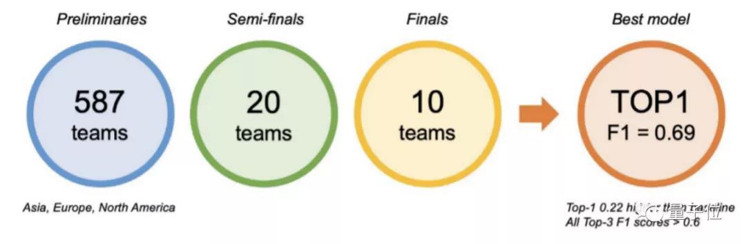 比赛也需要通过预赛、半决赛和决赛三场比赛,从最初的提交结果中依次筛选出20支和10支队伍,进行最终的测试集测试,并进行复现。
