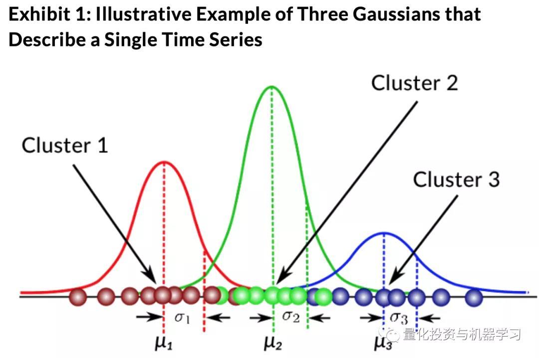 近些年很多研究根据数据驱动的模型对市场状态进行划分,常用的模型有Gaussian Mixture Model (GMM),这是一种无监督学习。GMM应用不同的高斯分布拟合不同时期的历史数据。如下图1所示,对于某单一资产的历史收益率,不同的历史区间对应了一个不同的高斯分布。