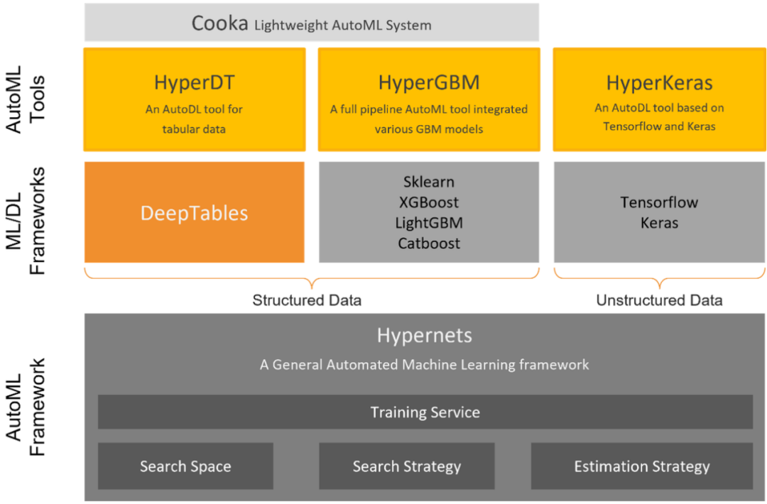DAT 的工具栈可以分为三层:首先是最底层的 AutoML 框架 Hypernets、机器学习和深度学习框架,中间是 AutoML 工具如 DeepTables、最上层是应用工具:HyperGBM、HyperDT、HyperKeras、Cooka。