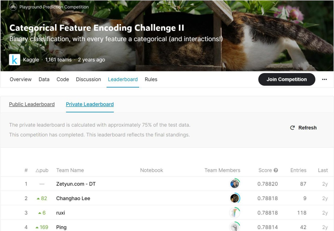 AutoML 自动生成的算法除了能够节省开发时间,实际工作的准确度如何?早在 DeepTables 工具刚刚构建完成时,九章云极 DataCanvas 的开发人员就参加了著名机器学习竞赛平台 Kaggle 的 Categorical Feature Encoding Challenge II 比赛,测试了自动机器学习算法的水平,并获得了成功。